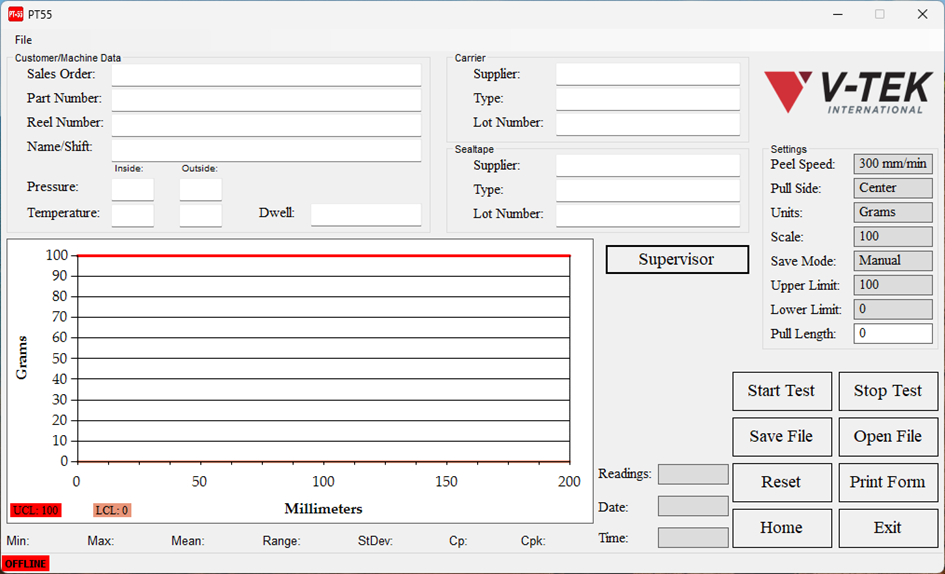 Start the PT-55 Software (S291257 v2.0.7951.19039.exe) and then click the V-TEK logo (top right) to import the machine’s latest calibration data to the PC.